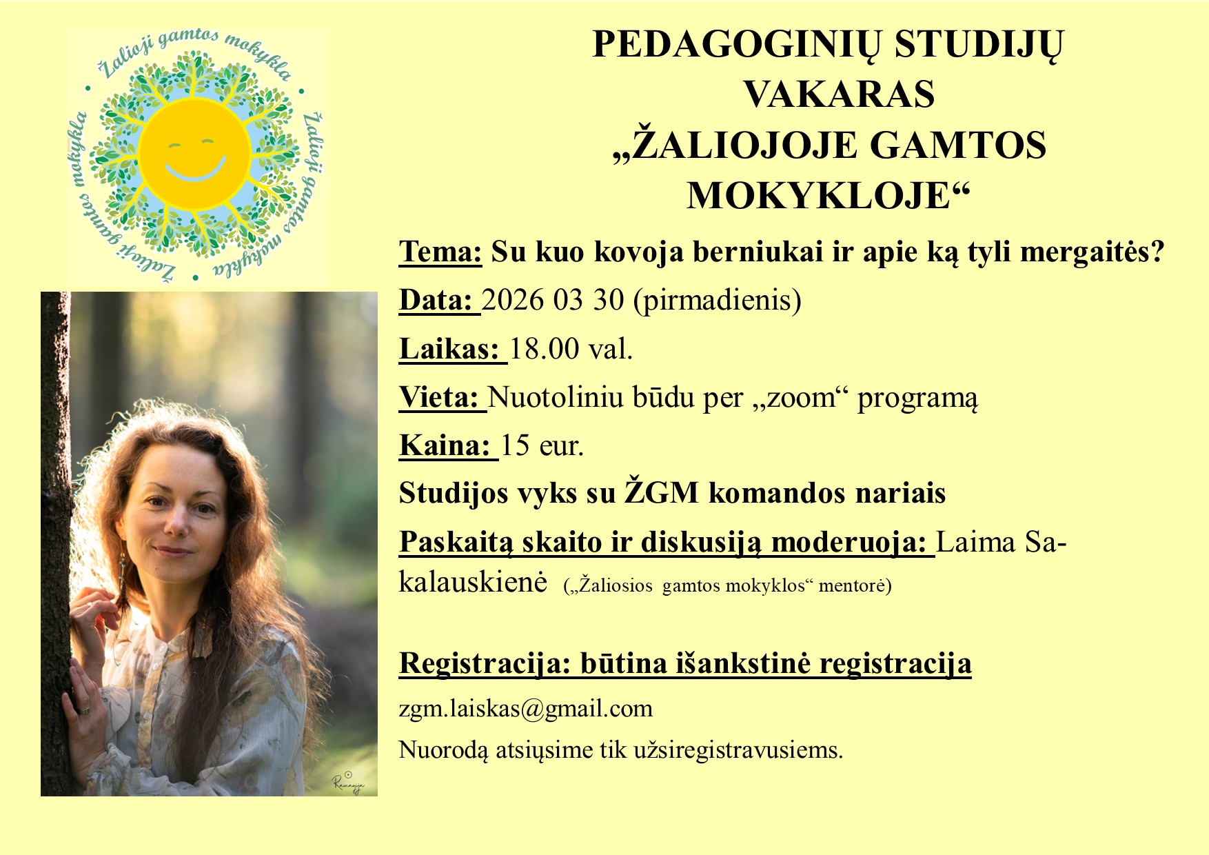 KVIEČIAME DALYVAUTI PEDAGOGINIŲ STUDIJŲ VAKARE SU ŽALIOSIOS GAMTOS MOKYKLOS KOMANDA IR SIEKTI MEISTRIŠKUMO TĖVYSTĖJE BEI PEDAGOGIKOJE